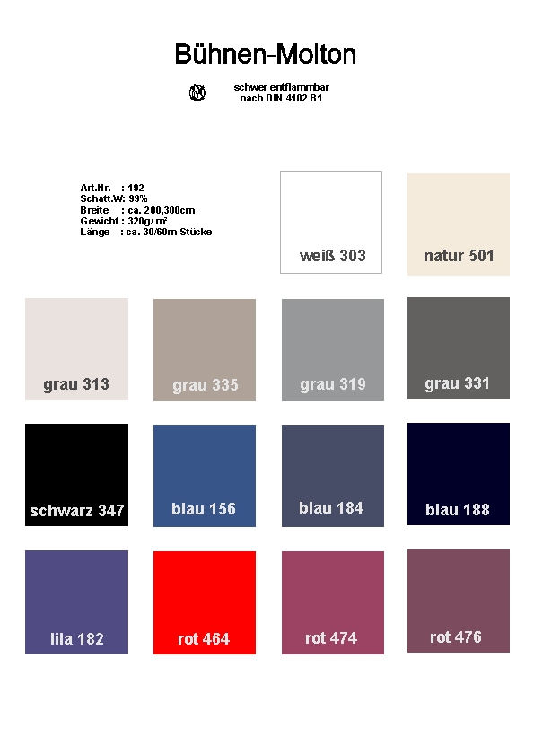 Bereits seit vielen Jahren haben wir eine der größten Farbpaletten im Bereich der Moltonstoffe. Beim Messemolton angefangen über den Deko- und Bühnenmolton bis zum Molton-CS und Verdunkelungsmolton sind es in der Summe über 150 Artikel.MAn könnte also sagen, dass wir nahezu jeden Wunsch erfüllen können.
