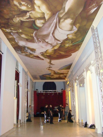Es fehlte die Deckenmalerei aus der sixtinischen Kapelle. Also machten wir uns auf den Weg, sie zu holen. Ein einfacher Traversenrahmen bot das Grundgerüst. Mit einer Grundfläche von 22x5m erreichten wir in 6m Höhe etwa die realen Maße. Die einfache Konfektion mittels Saum und Ösen bildete eine optimale Befestigungsmöglichkeit mittels Spanngummis an den Traversen. Die Eventdekorateure verdeckten die freien Horizontaltraversen mit einem 4x16er Nessel - die Vertikaltraversen wurden später innenbeleuchtet und brachten den Druck voll zur Geltung.
